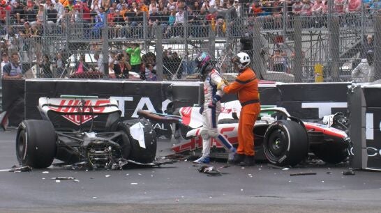 Fue en la vuelta 30 cuando mandaron de nuevo a los coches al 'pit lane'. El motivo, la reparación de las barreras tras un accidente fortísimo del piloto alemán de Haas. Tan fuerte es que su coche, por segunda vez esta temporada, terminó partido en dos.