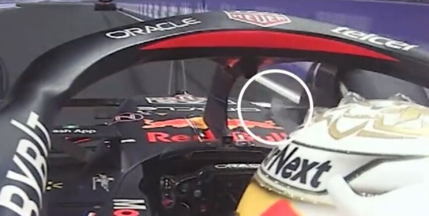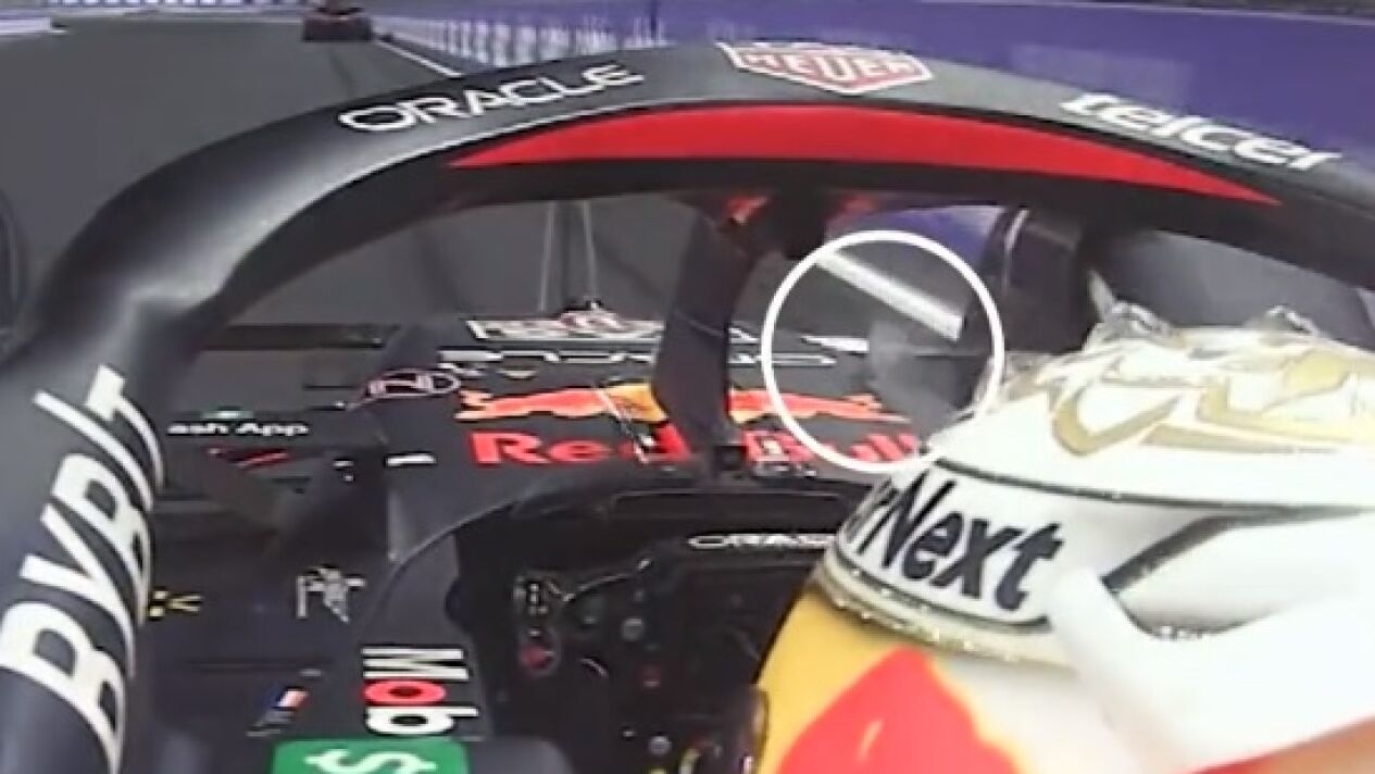 La F1 ha publicado el vídeo del momento en el que Verstappen retiraba este plástico, que se trataba de una lámina de la visera del casco de su rival de Ferrari.