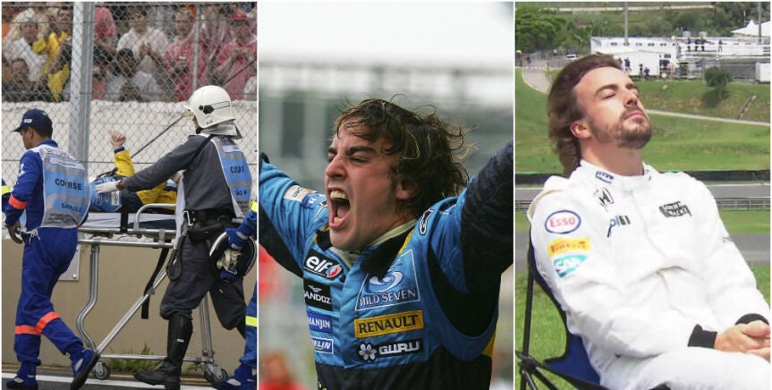 El piloto asturiano ha corrido en 17 ocasiones en el circuito de Interlagos, pero tres Grandes Premios de Brasil han marcado su carrera en Fórmula 1: un terrible accidente en 2003, la celebración de su primer Mundial en 2005 y su actitud sarcástica en 2015.