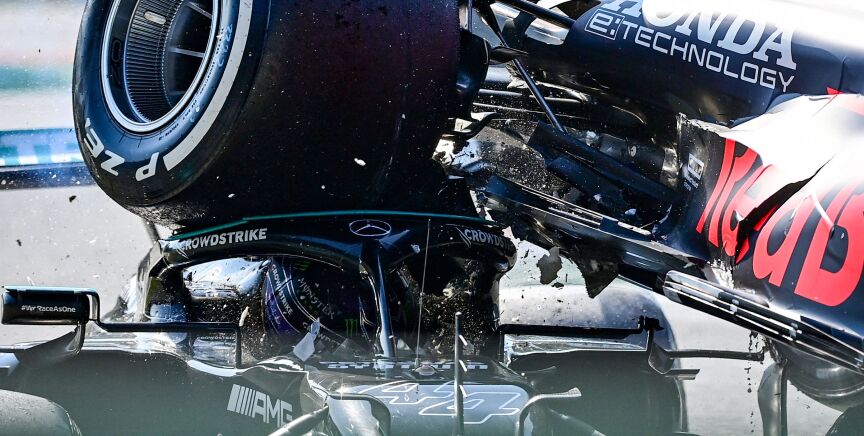 Lewis Hamilton pudo haber sufrido muchos más daños con el impacto del fondo plano y lateral del Red Bull de Max Verstappen, pero sobre todo con la rueda posterior derecha, que llega a golpear el casco del británico.