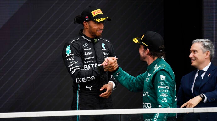 Sin embargo, la mala tracción del Mercedes en las curvas lentas y el buen rendimiento del 'mejorado' Aston Martin no le permitieron afianzarse bien en el segundo puesto y 22 vueltas después, Alonso recuperó su lugar. El piloto británico apretó en las últimas vueltas, pero no fue suficiente para adelantar a un Fernando Alonso que fue una auténtica roca.