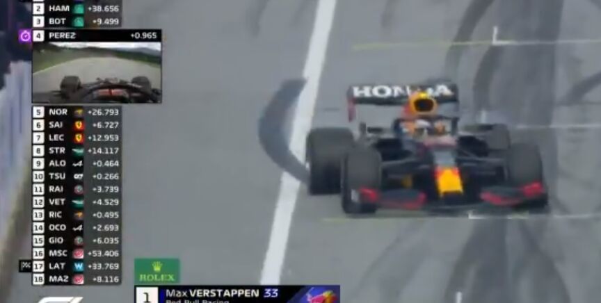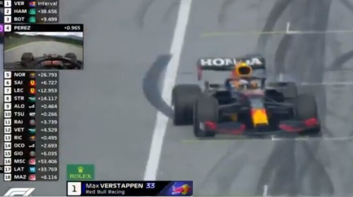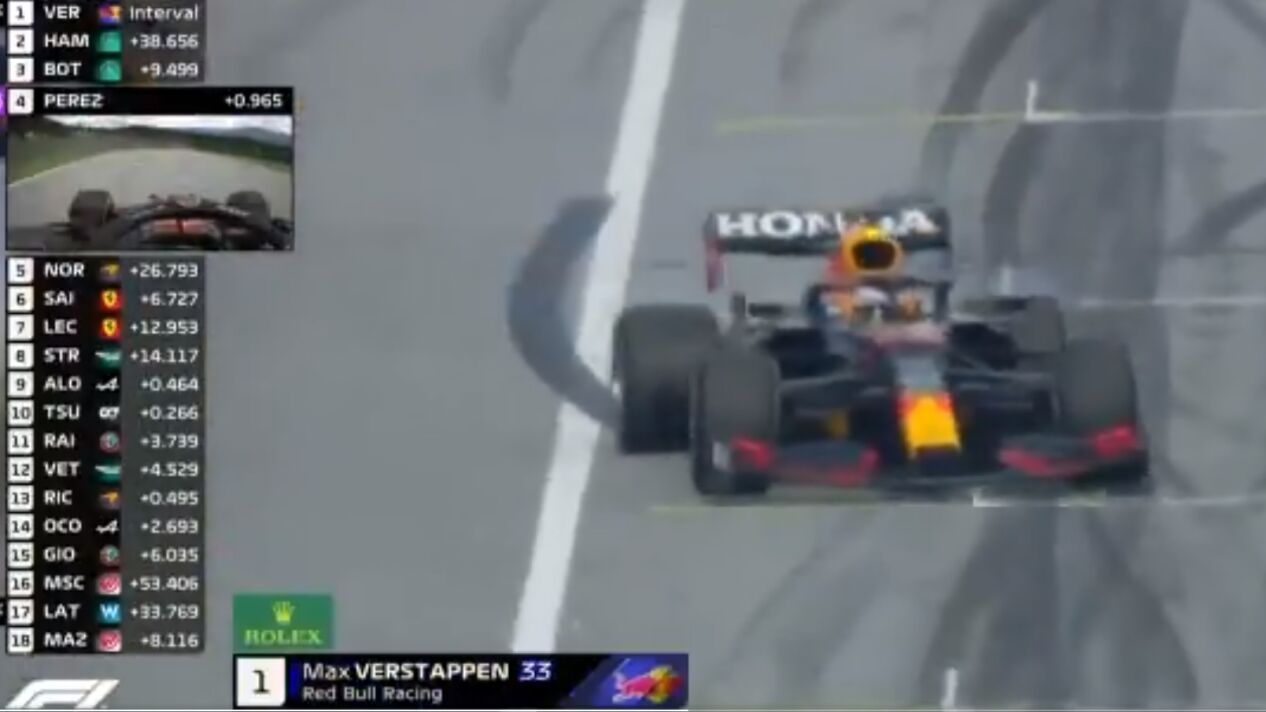 A su llegada a línea de meta, Verstappen redujo considerablemente la velocidad a su paso por la zona del muro donde se encontraban los mecánicos de Red Bull. Tras ello, estampó su firma en el asfalto quemando las ruedas del RB16.
