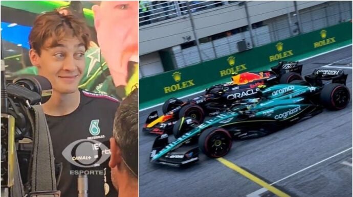 La incrédula reacción de Russell al ver la batalla entre Fernando Alonso y 'Checo' Pérez en Brasil