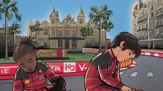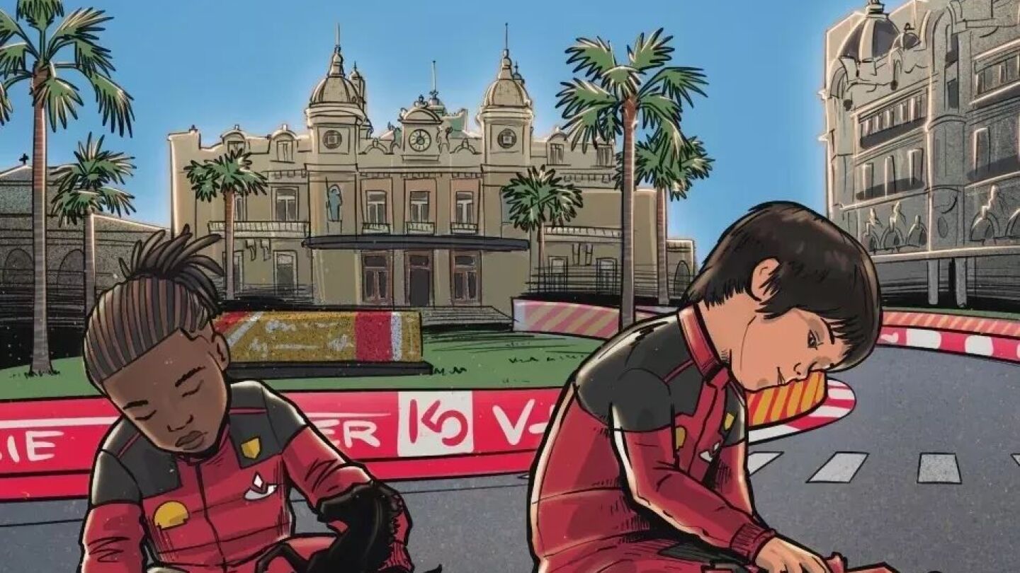En la misma, frente al casino, figuran el autóctono Charles Leclerc y Lewis Hamilton, quien aún pilota para Mercedes.