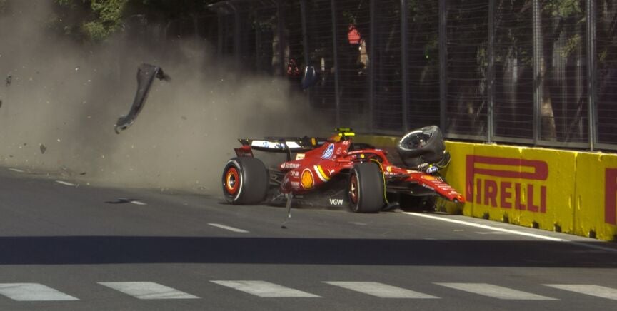 Final muy, muy movido en el Gran Premio de Azerbaiyán. Final con toque. Con choque. Con accidente. Con un fuerte accidente. Uno en el que estuvo involucrado Carlos Sainz. En el que también lo estuvo Sergio Pérez. Uno que, en la vuelta 49 de la pista de Bakú, dejó a los dos fuera de carrera y contra el muro.