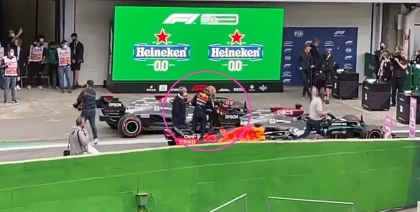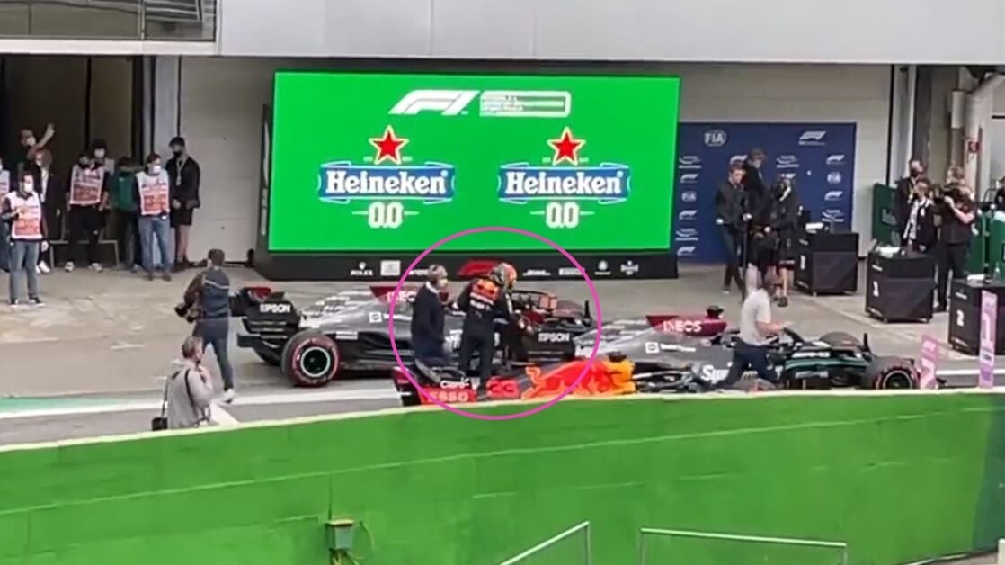 Max Verstappen se acercó al Mercedes de Lewis Hamilton tras la clasificación de Brasil. El neerlandés examinó, y tocó, el alerón trasero de un coche bajo la lupa de los comisarios.