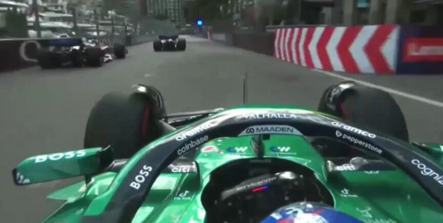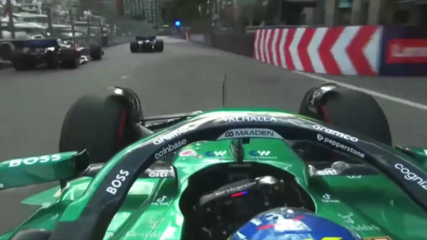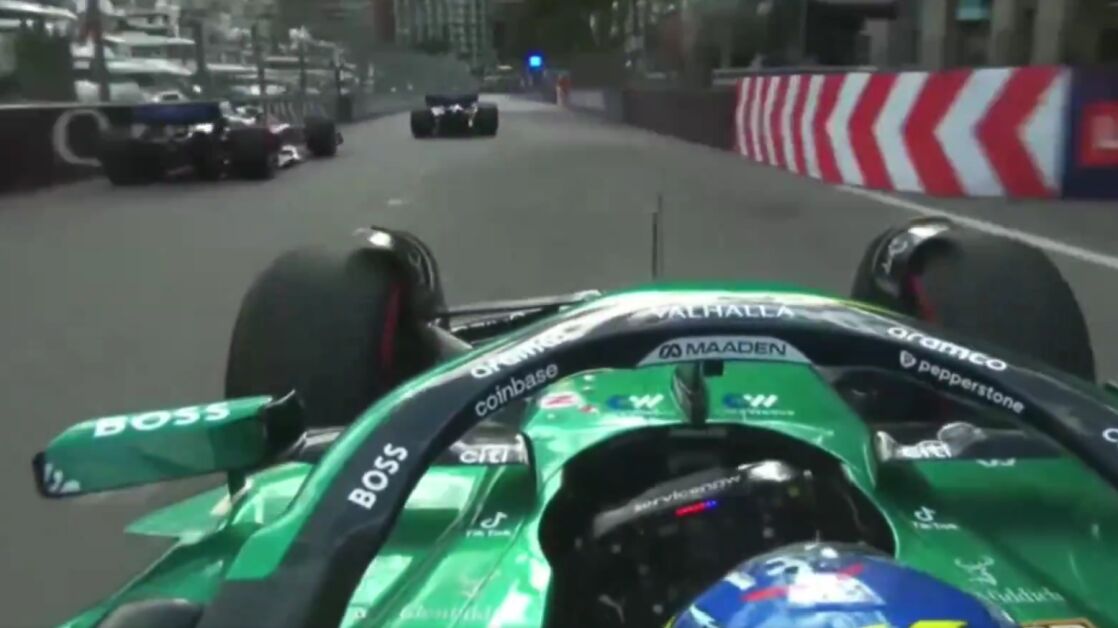 El piloto de Aston Martin venía en vuelta con los neumáticos blandos cuando, tras la salida del túnel, se cruzó de nuevo con los coches pintados de rojo. Esta vez, se encontró no con uno, sino con los dos a la vez, que circulaban por las calles del Principado con total parsimonia.