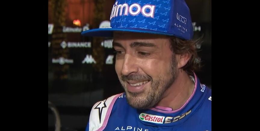 Fernando Alonso no pudo ocultar su felicidad en las cámaras de 'DAZN' cuando pensó en cómo llegaba Alpine al GP de Bahrein tras sus 122 vueltas y tercer mejor crono en los test.