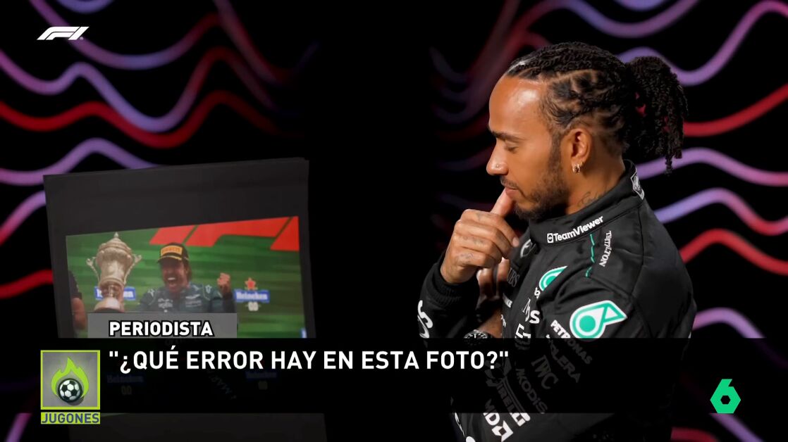 "¿Qué está mal en esta foto?", pregunta la F1, y Lewis Hamilton, a pesar de saber la respuesta correcta, lanza su 'palo': "Que Alonso está en el podio".