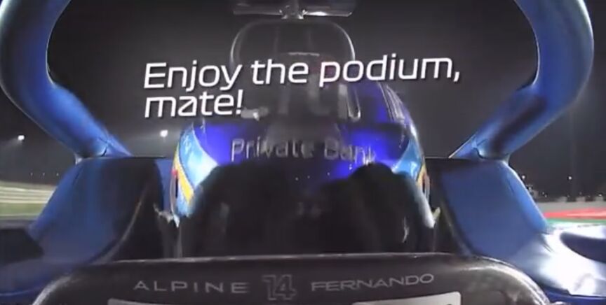 La cámara onboard de Fernando Alonso al término del Gran Premio de Catar es oro puro: después de que le comunicaran que había sido nombrado Piloto del Día y de que su ingeniero le diera la enhorabuena por el podio, el asturiano entró en éxtasis.