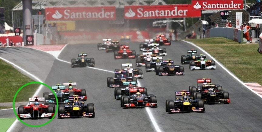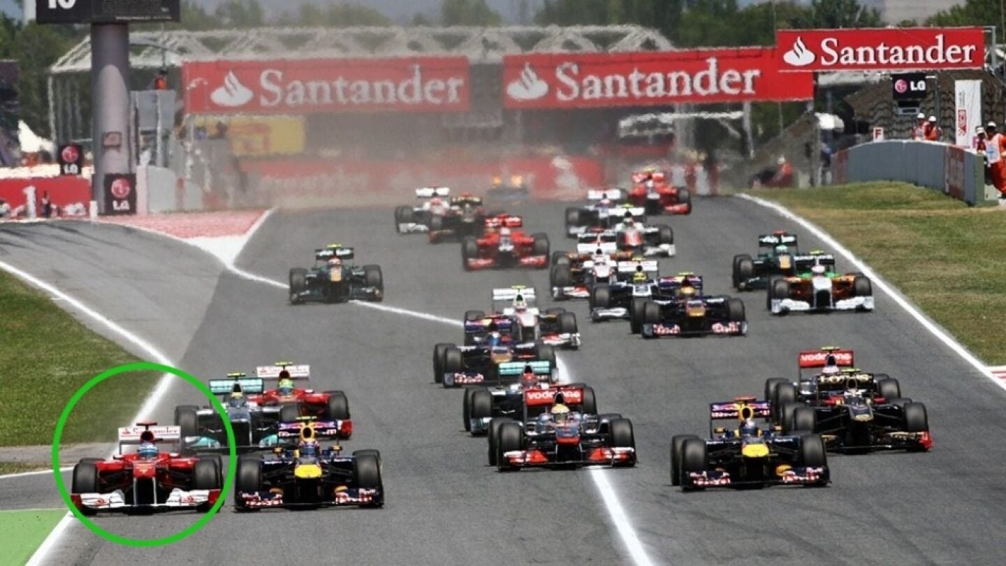 Montmeló fue testigo de una de las mejores salidas de la historia de la Fórmula 1. Alonso partía desde la cuarta posición con un Ferrari que, ni por asomo, podía competir con un equipo Red Bull que ganó el campeonato con una superioridad asombrosa.