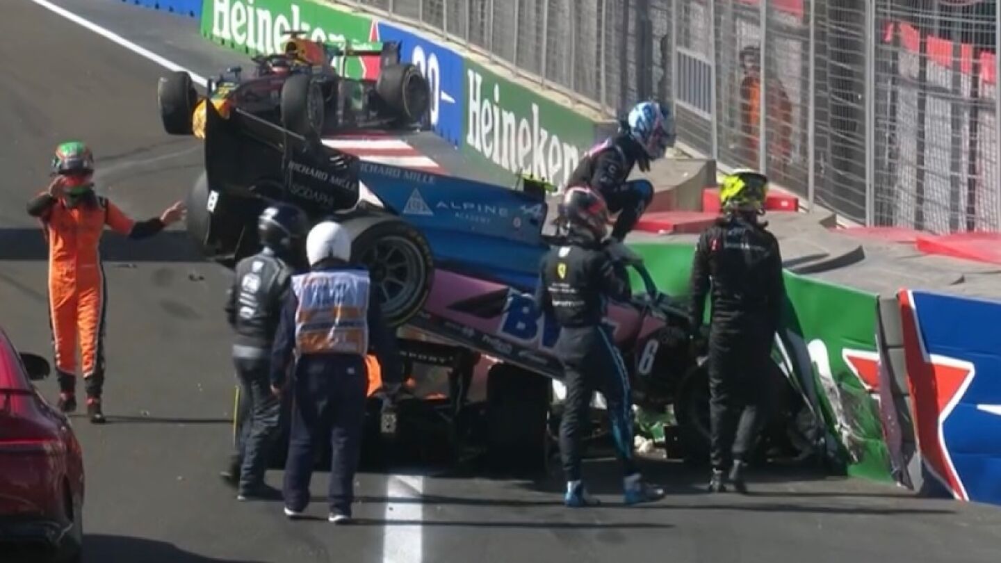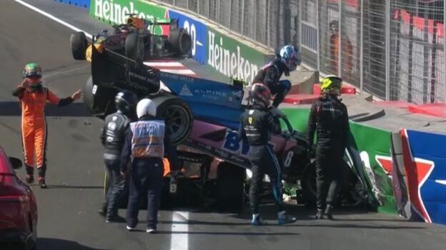 En plena relanzada. Dos coches empotrados uno encima de otro. Afortunadamente TODO el mundo está bien 🙏#AzerbaiyanDAZNF1 🇦🇿 pic.twitter.com/YCYhqiBL9k