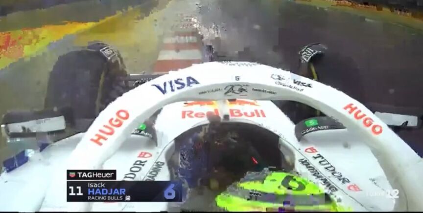 El joven francés se tragó una tormenta de piedras y gravilla en la vuelta siete. Una nube de polvo se levantó ante Hadjar como consecuencia del rozamiento del monoplaza que lo antecedía con el borde del trazado.