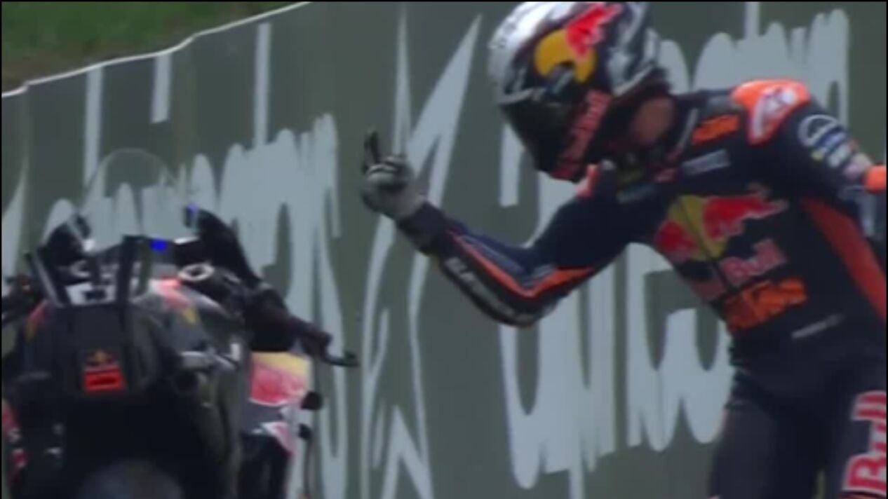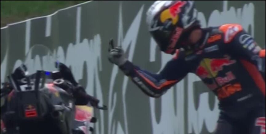 Pedro Acosta golpeó en repetidas ocasiones su moto antes de detenerse por completo para bajarse de la misma. La causa del fallo mecánico, la rotura completa de su cadena. Es en ese momento, cuando la frustración alcanza su punto álgido y el piloto le saca una 'peineta' a su propia moto aparcada. Después, continúa su camino a pie mientras sigue haciendo aspavientos y golpeando la valla publicitaria.