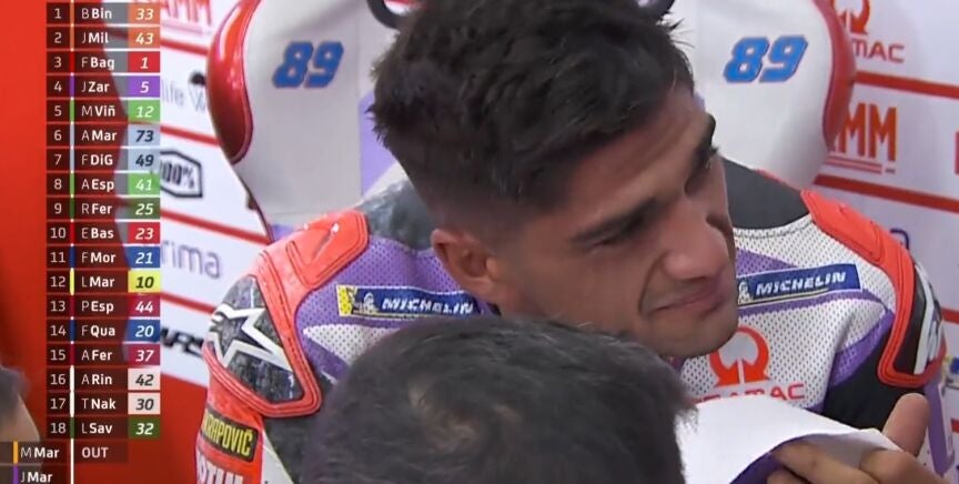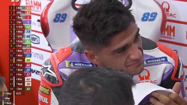 Jorge Martín rompió a llorar en el box de Pramac. El madrileño se quedó sin opción alguna a pelear en Valencia cuando, faltando 22 vueltas, se fue al suelo en un accidente con Marc Márquez.