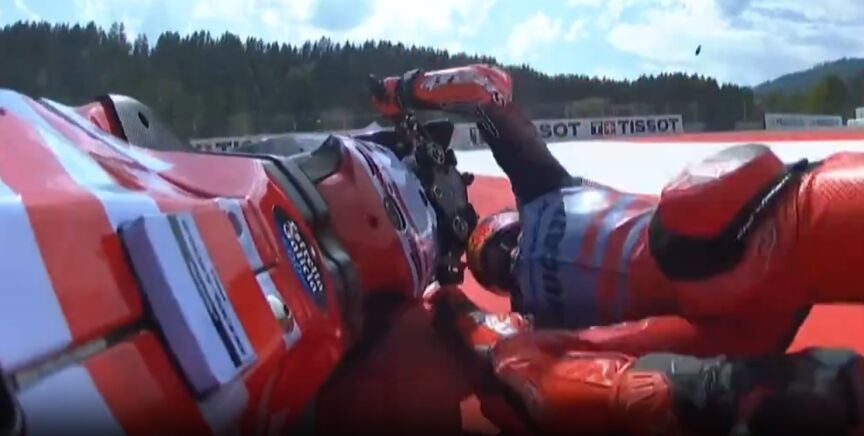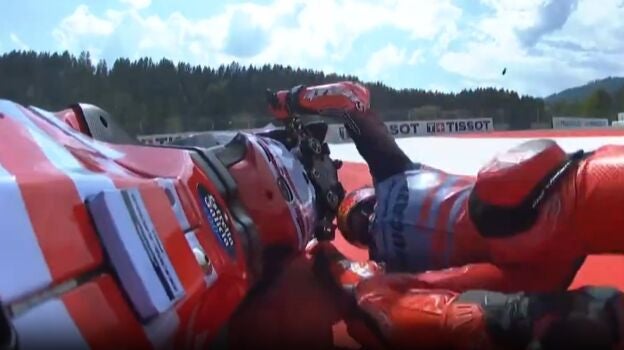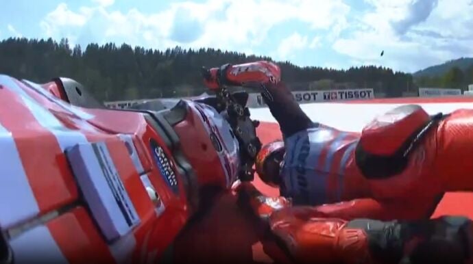 Marc Márquez se ha vuelto a caer. El de Cervera, piloto de Gresini, se fue al suelo en el sprint de Austria cuando marchaba segundo y buscaba estar en la pelea por la victoria. Sin embargo, cuando quedaban cinco vueltas para el final, terminó visitando el asfalto.