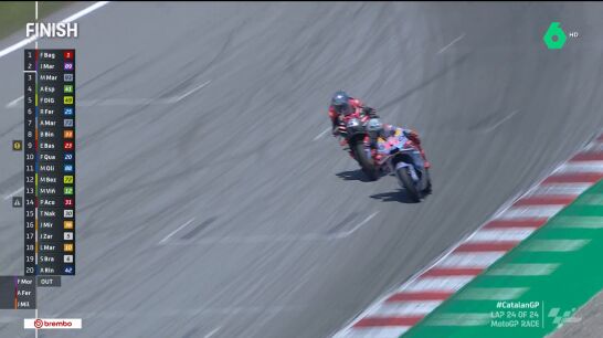 Marc Márquez y Aleix Espargaró protagonizaron una durísima batalla final en la última vuelta del GP de Catalunya de MotoGP. El de Gresini adelantó al de Aprilia en los giros finales de la carrera, pero el catalán ni mucho menos se rindió para terminar lanzando un ataque final que se quedó en un 'casi'.