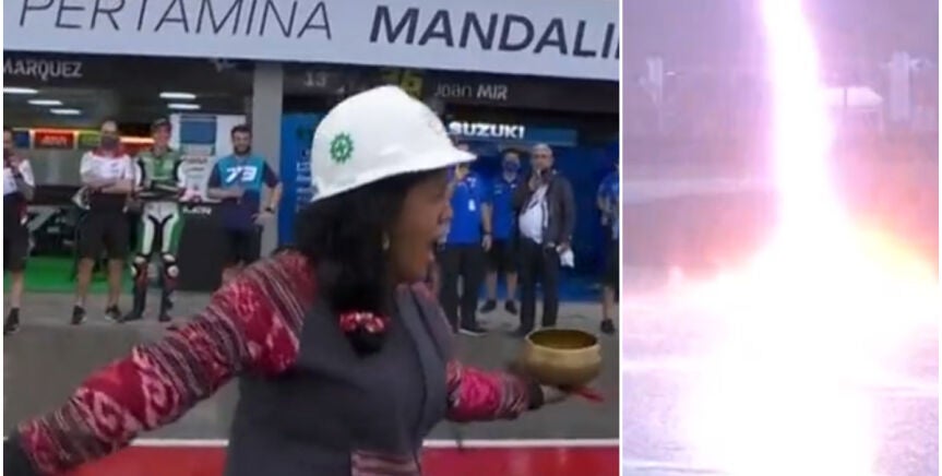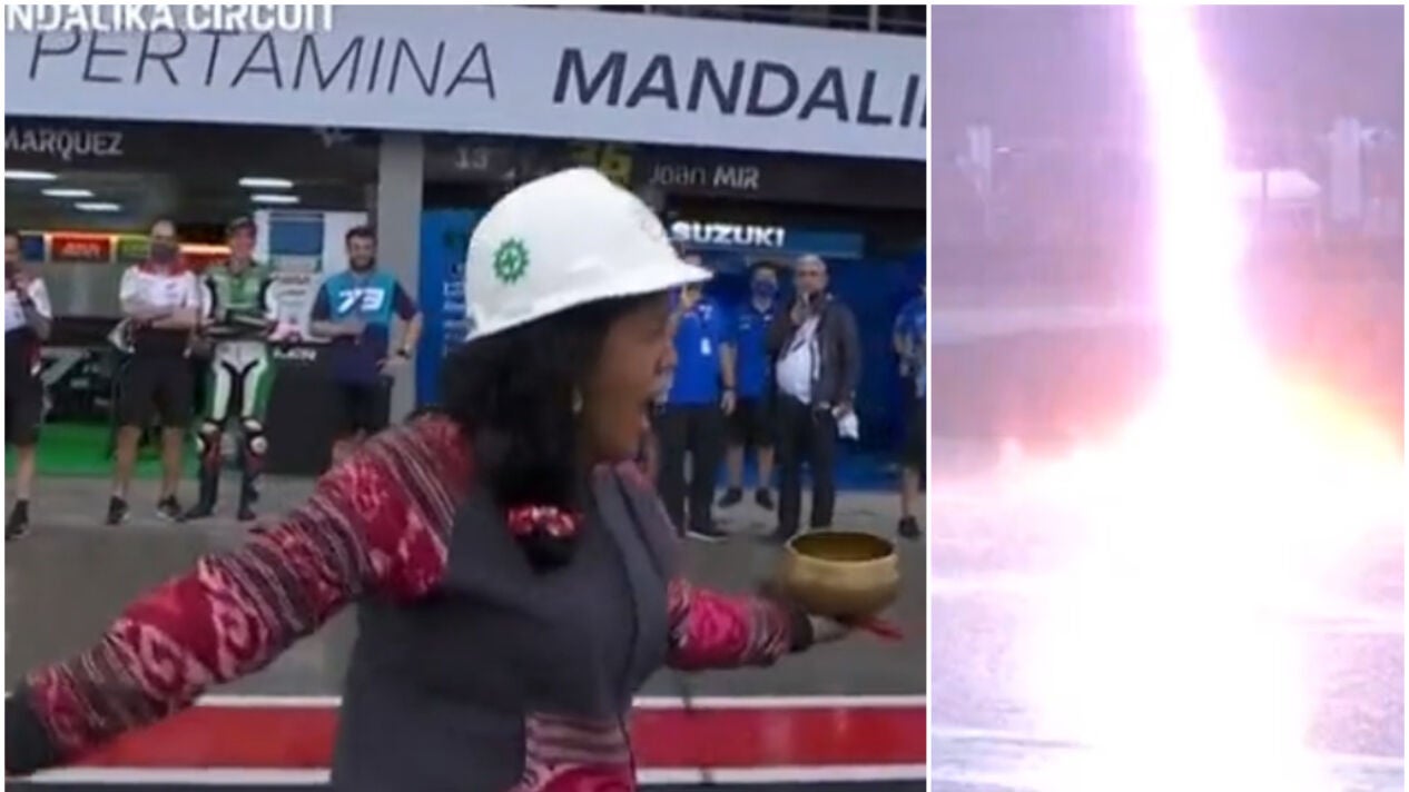 Entretenidísima fue la espera para la carrera de MotoGP en Mandalika. Ante la intensidad de la lluvia, dirección de carrera decidió enviar a una trabajadora a realizar un ritual para que el cielo dejase de soltar agua.