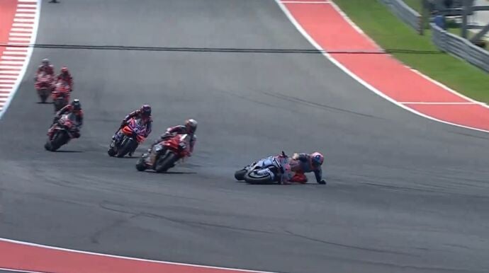 Marc Márquez se fue al suelo en el peor momento en el Gran Premio de las Américas. Lideraba por delante de Pedro Acosta y Jorge Martín... y su freno delantero dijo basta. Llevaba toda la carrera con dificultades y su tarde en Austin acabó en caída.