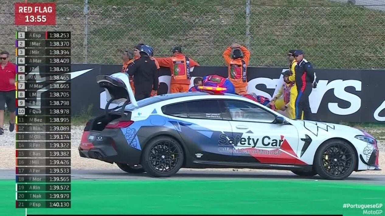 Posteriormente emitieron las imágenes. Tras salir despedido se golpeó fuertemente contra el asfalto, para terminar chocando contra las barreras de la pista. Además, la moto tocó a Espargaró. En ese instante se mostró bandera roja.