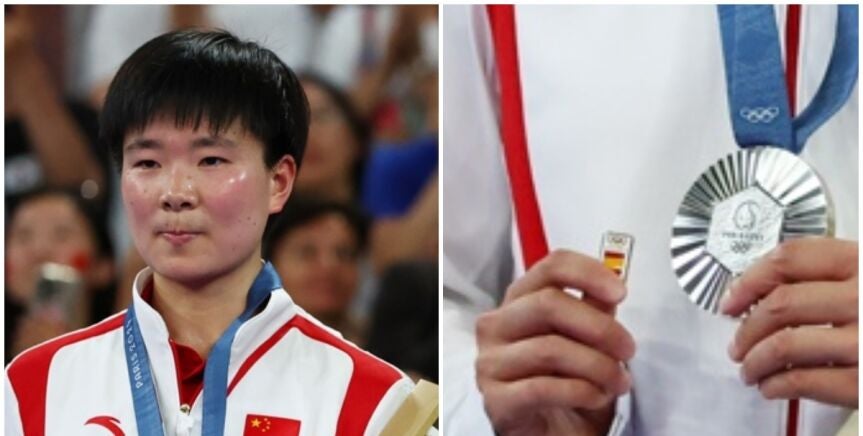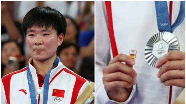 He Bing Jiao, rival de Carolina Marín en esa cruel semifinal en París, subió a recoger su medalla de plata con un pin con la bandera de España en un precioso y deportivo gesto olímpico.