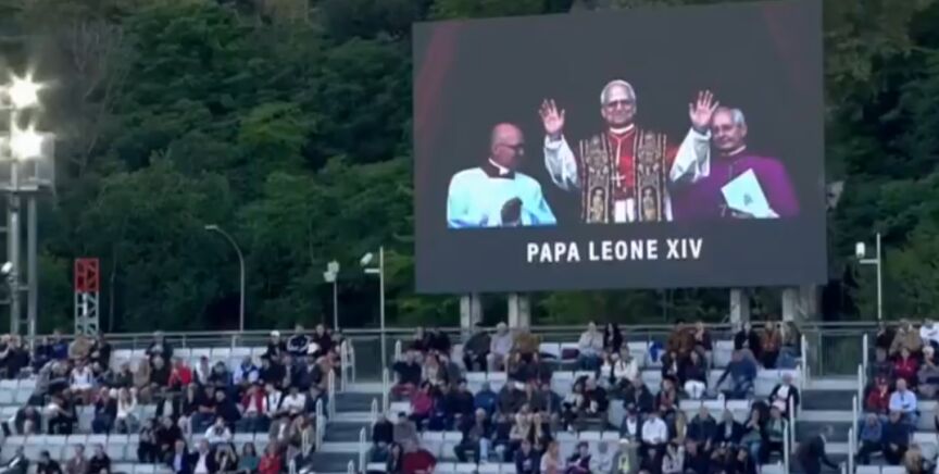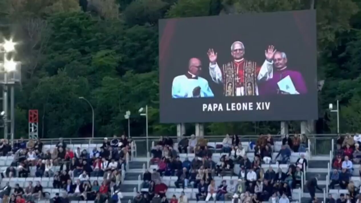 Durante un descanso, las pantallas del recinto emitieron una imagen del nuevo papa, a lo que el público replicó con aplausos.