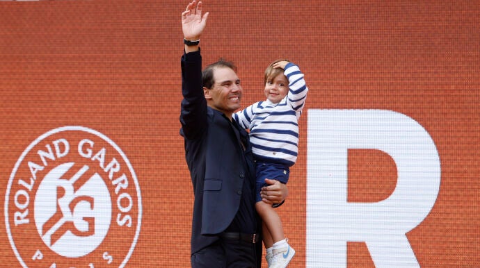 Rafa Jr. acompañó a su padre a pie de pista en el homenaje que le brindó Roland Garros este domingo.
