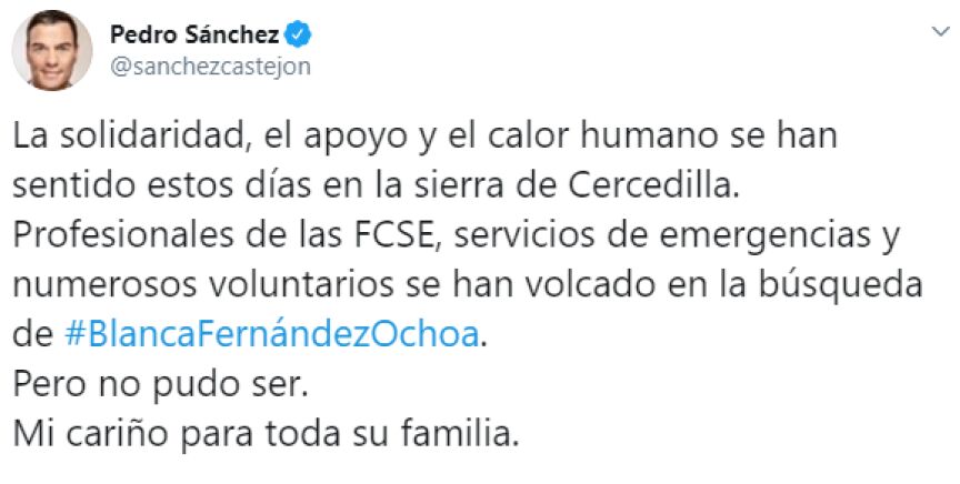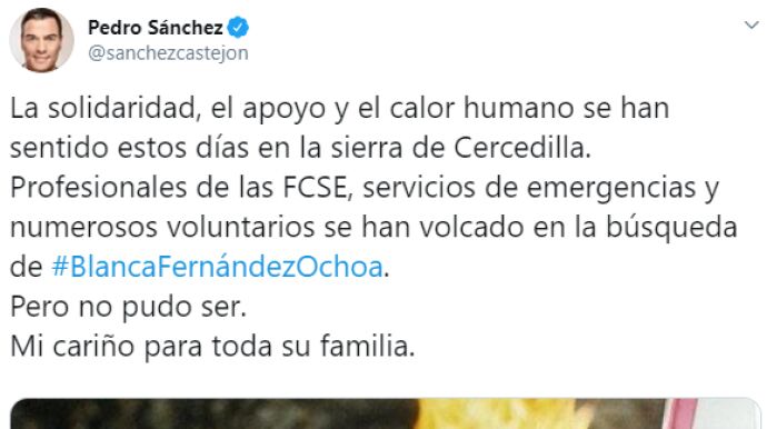 Pedro Sánchez, Pablo Casado o Albert Rivera han sido algunos de los que han dejado mensajes de condolencia tras la confirmación del hallazgo del cuerpo de la esquiadora.