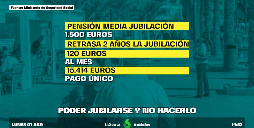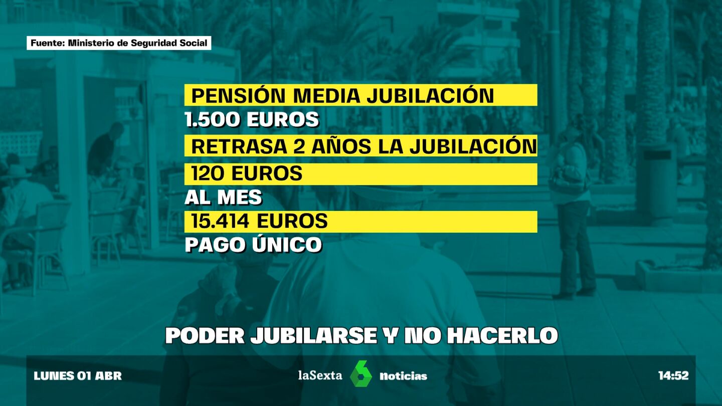 Desde 2022 la cifra de personas que opta por retrasar su jubilación no ha parado de crecer. Suponen ya el 10,5% del total de personas que se jubilan. Se ha duplicado en gran medida por los incentivos económicos que puso en marcha el Gobierno, que se traducen para una persona con una pensión media de 1500 euros en 120 euros más al mes o un pago único de 15.000 euros.