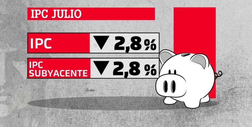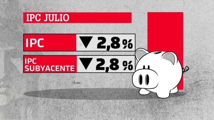El índice de precios de consumo (IPC) se moderó en julio hasta el 2,8 % interanual, seis décimas menos que el mes anterior, por el abaratamiento de la electricidad, mientras que la inflación de los alimentos se recortó 1,1 puntos, hasta el 3,1 %.