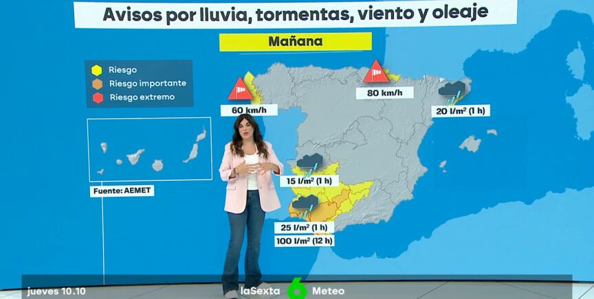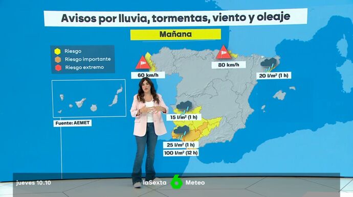 Por otro lado, también estarán en aviso por lluvia las provincias de Jaén, Barcelona y Badajoz; y se registrarán aviso por tormentas en Cádiz, Córdoba, Huelva y Sevilla . Asimismo, habrá aviso por olas en A Coruña y Pontevedra y por viento la vertiente cantábrica de Navarra y el Pirineo navarro.