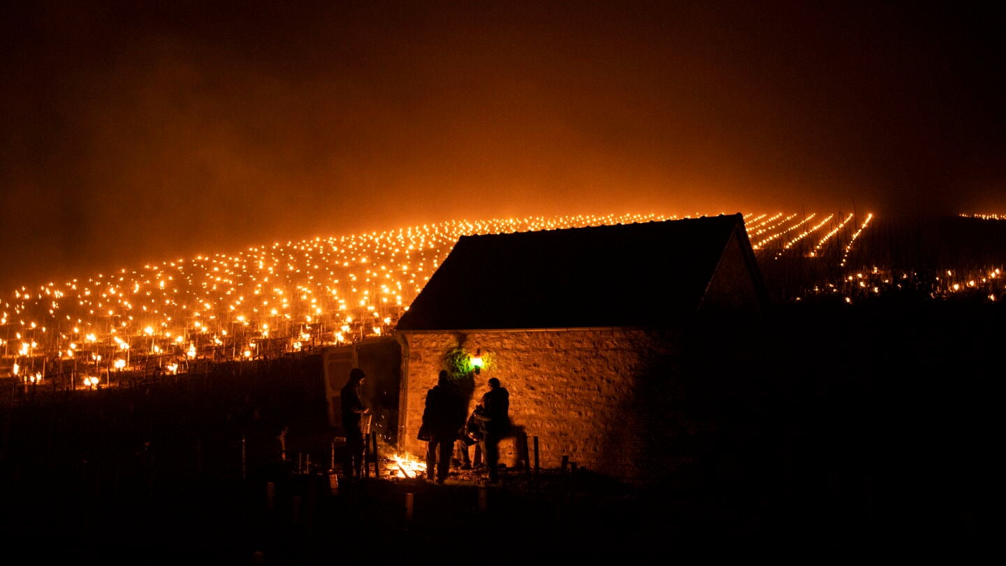En los viñedos de Francia, como se ve en la imagen superior, han intentado combatir a este tipo de fenómeno encendiendo pequeños fuegos en torno a los cultivos.