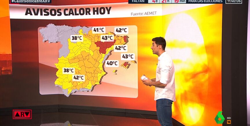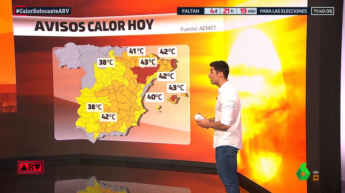 En seis provincias son avisos rojos, en Aragón, Cataluña y Baleares, siendo este el día con más avisos rojos del año. Y eso que ya este lunes tuvimos la temperatura más alta del año, en Andújar, Jaén, con 44,9ºC.