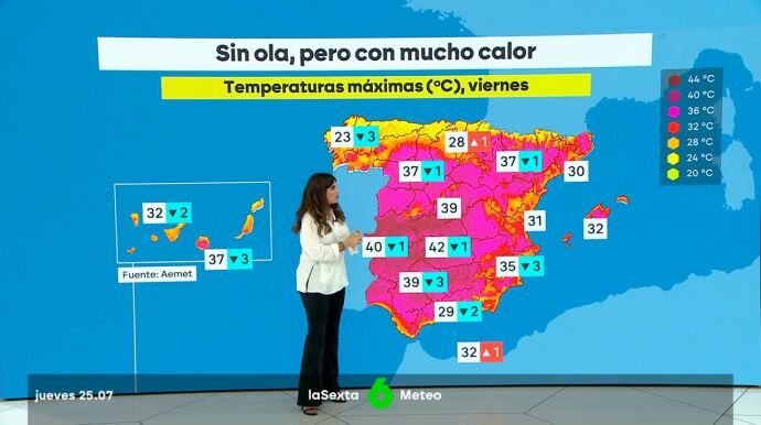 Las temperaturas máximas tenderán a descender, más acusadamente en Canarias y en el sur y este peninsular, y con algunos aumentos en el entorno del alto Ebro. Pese a ello se mantendrán por encima de 35 grados en amplias zonas de Andalucía, ambas mesetas, nordeste peninsular, vertientes sur de Canarias e interior de Mallorca. Incluso puedan alcanzarse los 40 en los valles del cuadrante suroeste.