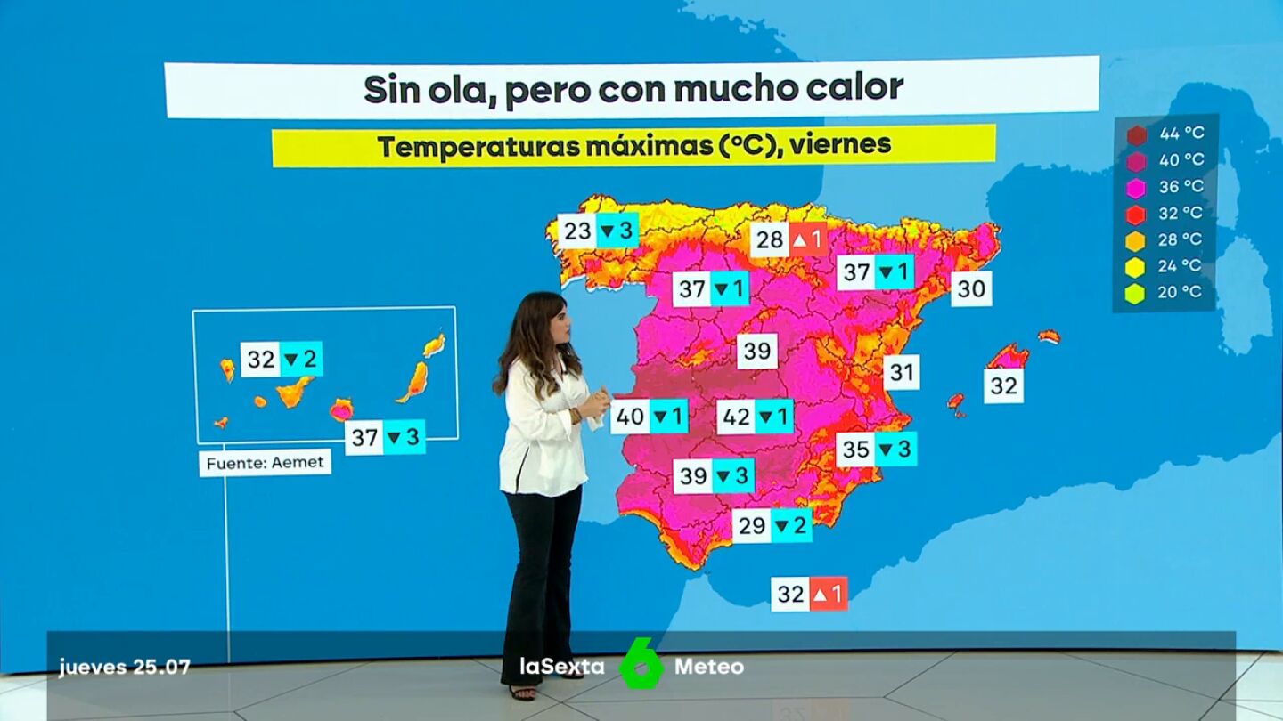 Las temperaturas son significativamente elevadas este viernes, pero las máximas tenderán a descender y alcanzarán los 39-42 grados, según la previsión de la Aemet. Sin embargo, el centro peninsular sigue con aviso naranja.