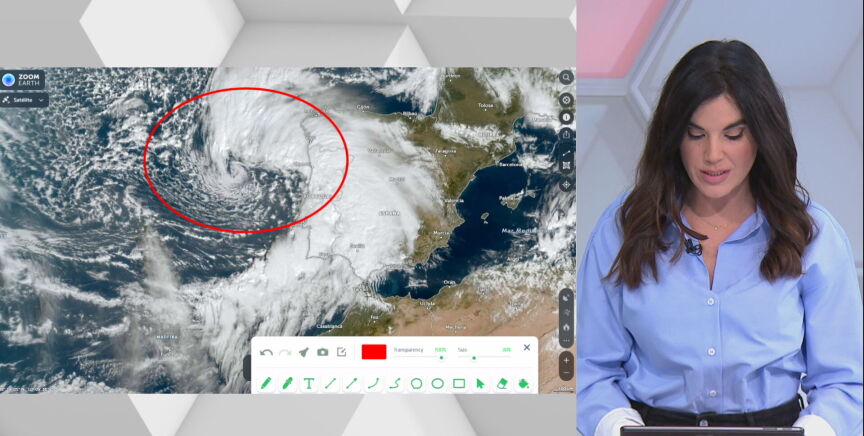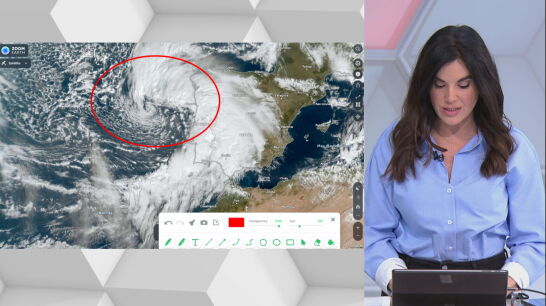 Marta, una nueva borrasca, irrumpe con fuerza. En la imagen de satélite se puede observar perfectamente su centro, justo enfrente de Oporto. Tras la marcha de la borrasca Leonardo, preocupa especialmente los efectos de Marta sobre la Comunidad de Madrid, el valle del Guadalquivir y el golfo de Cádiz. "Por ahí está entrando el primer sistema central de la nueva borrasca, dejando ya muchísima precipitación. En el golfo de Cádiz hay riesgo de que se produzcan mangas marinas y tornados", explica Joanna Ivars, que apunta que esa cabecera acabará impactando con la zona montañosa de Grazalema (Cádiz).