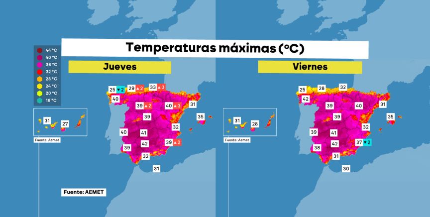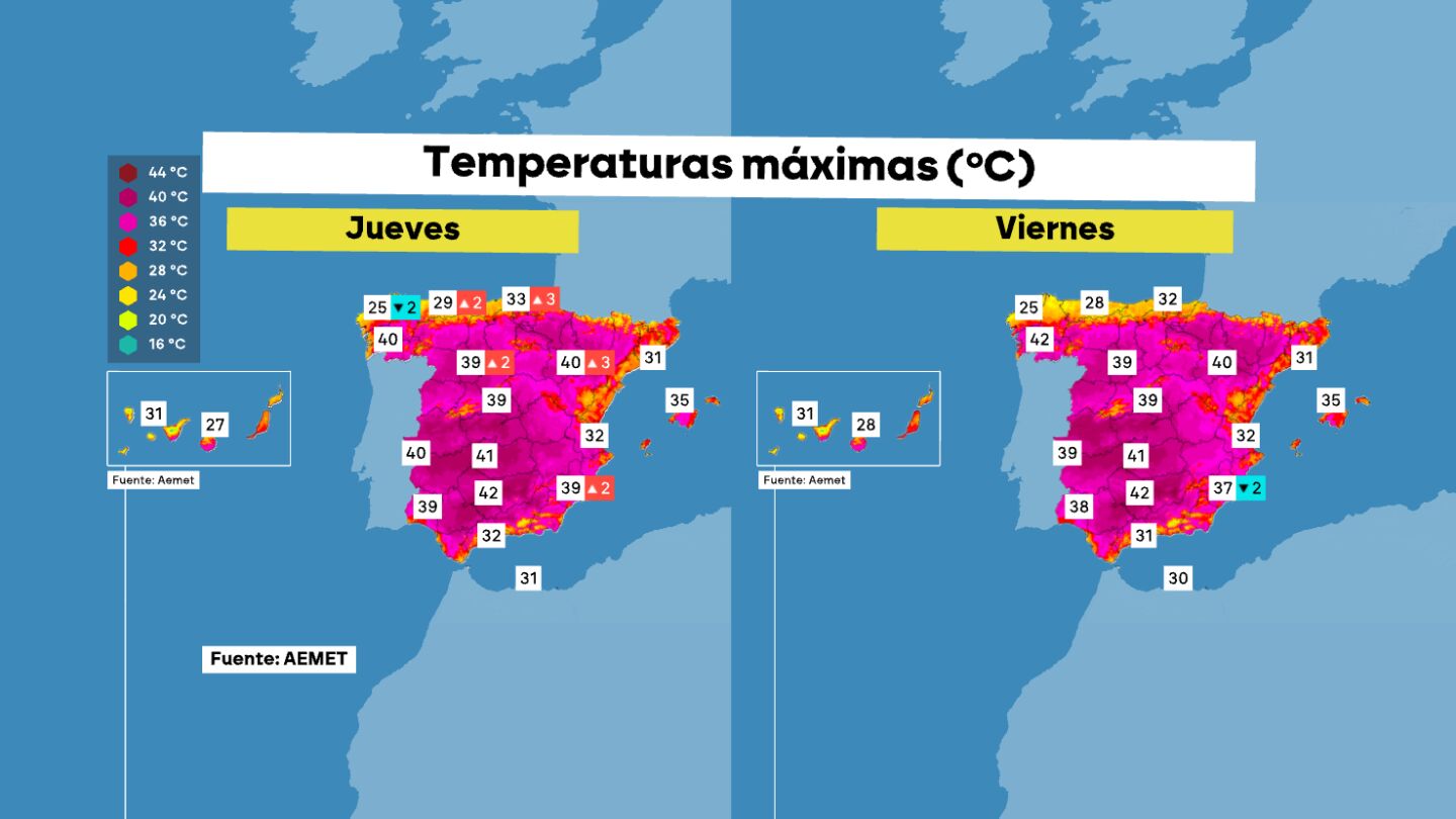 Para el viernes, vemos cómo los avisos naranjas se mantienen en zonas del norte y el calor sigue siendo intenso en zonas del centro. En cuanto a las temperaturas, se espera que se disparen por encima de los 40 grados.