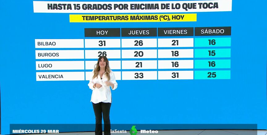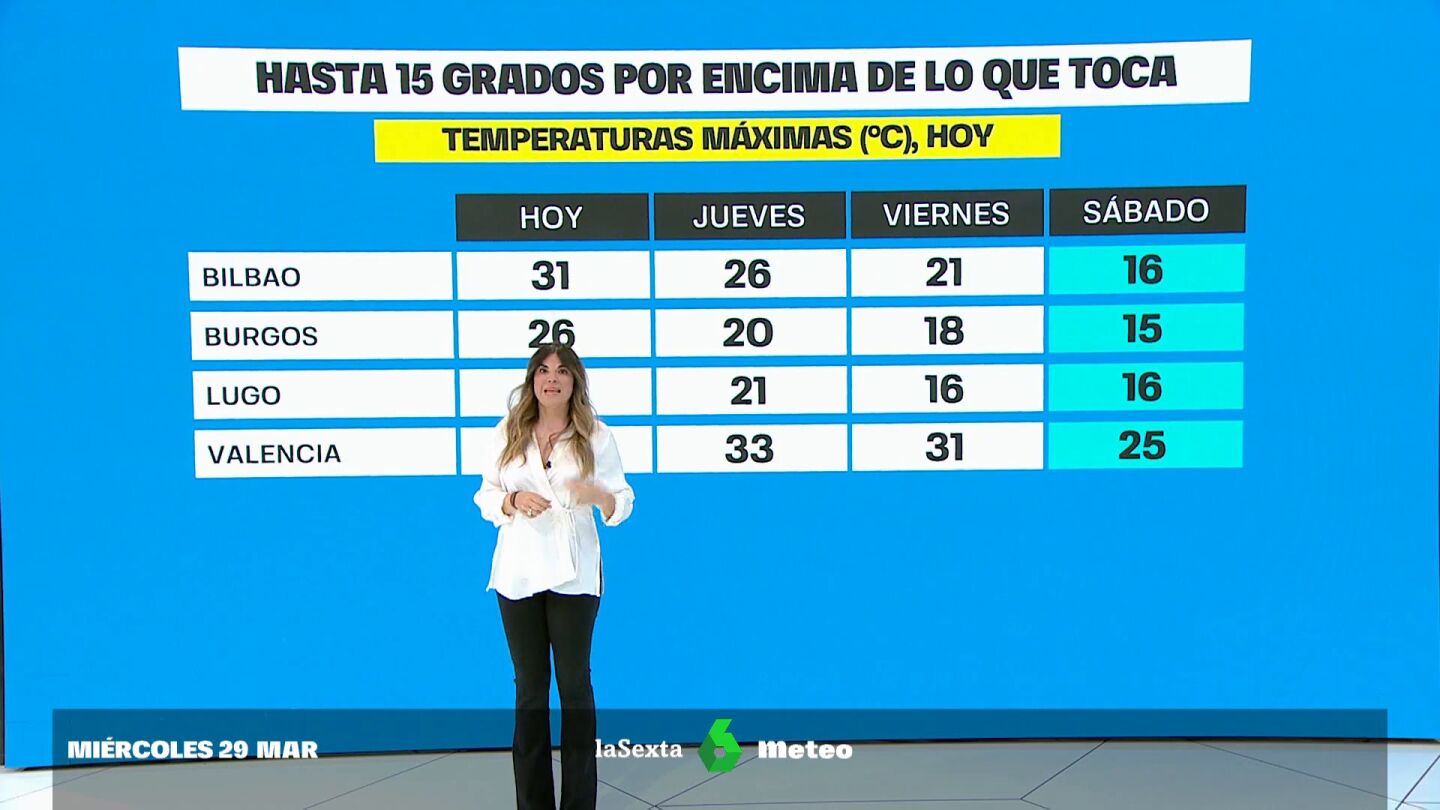 De esta forma, en zonas como Bilbao que hoy han alcanzado los 31 grados, para el sábado se espera que su máxima sea de 16. Una situación parecida a la que se vivirá en Burgos, donde pasarán de los 26 grados a los 15ºC.