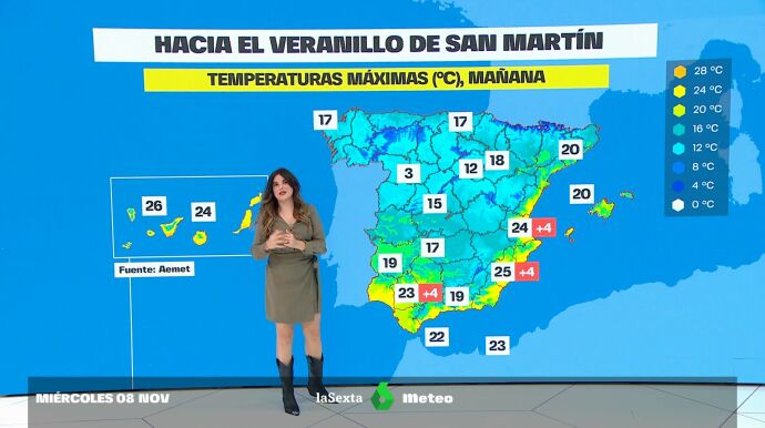 De hecho, el domingo será una jornada con al menos 25ºC grados en otras capitales mediterráneas y canarias: 28ºC en Alicante y Valencia, 27ºC en Castellón de la Plana y Santa Cruz de Tenerife, 26ºC en Málaga y 25ºC en Las Palmas de Gran Canaria y Tarragona.