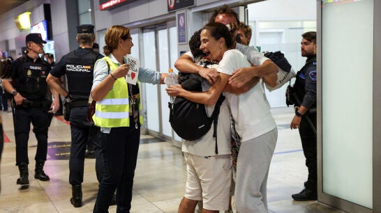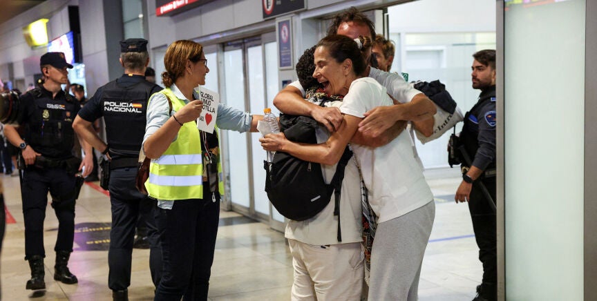 El primer grupo formado por 21 activistas españoles de la Flotilla Global Sumud liberados por Israel ya se encuentra en España tras aterrizar en el Aeropuerto Adolfo Suárez Madrid Barajas. A su llegada, han sido recibidos con gritos de "¡Que viva la lucha del pueblo palestino!", "Viva Palestina libre", "¡Gaza aguanta, el mundo se levanta!" y "¡No es una guerra, es un genocidio!".