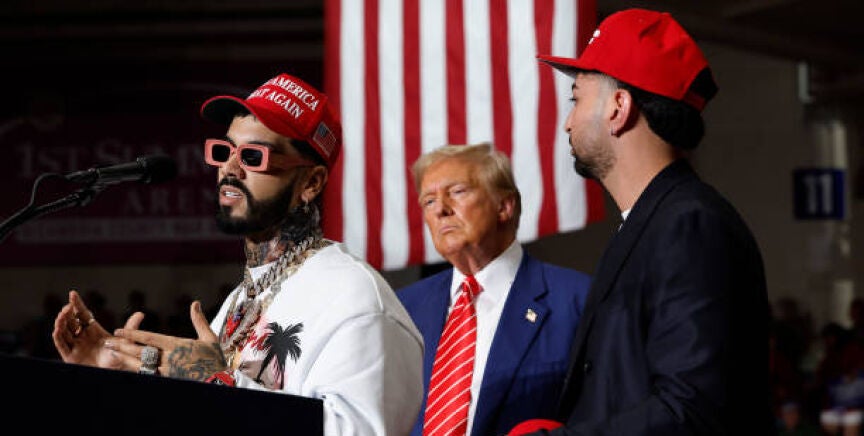 Ambos músicos posaron junto al expresidente ataviados con la conocida gorra roja con el lema 'Make America Great Again', y también una versión blanca con el mensaje 'Make Puerto Rico Great Again'. Los dos artistas son fundamentales en la estrategia de Trump para poder captar el voto latino en los comicios de noviembre.