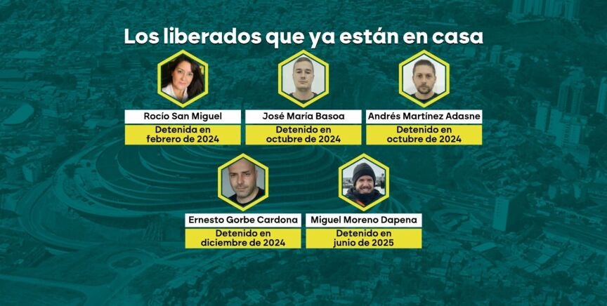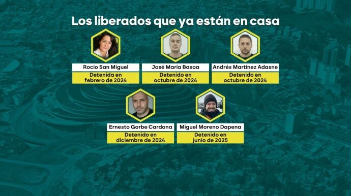 En esa liberación de presos están los cinco españoles que ya han llegado a Barajas. Están José María Basoa, Andrés Martínez Adasme, Miguel Moreno, Ernesto Gorbe y Rocío San Miguel. Están cinco personas que ya han vuelto a casa. A España. Que se dirigen ya a sus respectivos hogares después de meses de cautiverio en Venezuela.