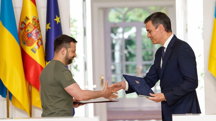 Sánchez, que se ha dirigido a Zelenski como "buen amigo", ha señalado que España renueva su apuesta para "contribuir a la seguridad y defensa" de Ucrania. "Acabamos de firmar un acuerdo de enorme trascendencia, que es un nuevo ejemplo de su determinación. Nos convertimos en el décimo país que firma este acuerdo", ha destacado el presidente en la rueda de prensa junto a su homólogo ucraniano, que habla de tres áreas: "seguridad, apoyo militar, financiación y ayuda a la reconstrucción".