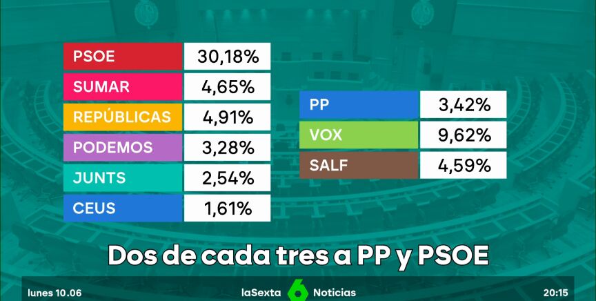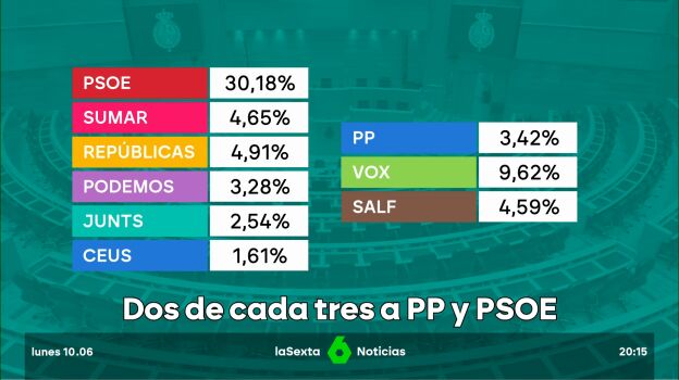Sin embargo, el panorama político no ha variado tanto. Dos de cada tres votantes han elegido las papeletas del PSOE o del PP por PP o por PSOE. Y los bloques apenas se han movido. Los que apoyaron a Sánchez para la investidura sumaron anoche el 47,2% de los votos. Los que votaron al PP y Vox, sumando la incorporación de 'Se acabó la fiesta', obtuvieron un 48,4%.