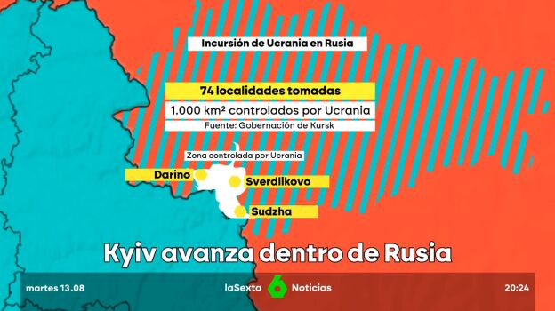 Asimismo, el ejército ucraniano parece imparable, ha conquistado 74 localidades que ocupan más de 1.000 kilómetros cuadrados. Con el avance de la ofensiva van tomando prisioneros que se dirigen directamente a su líder, Vladimir Putin: "Pedimos un intercambio por los soldados de Azov". Núñez asegura que "lo máximo que puede esperar Ucrania y por tanto ahí está el éxito de la operación, es que Rusia tenga que desviar unidades que ahora están actuando en la zona del Donbás (al Kursk)"