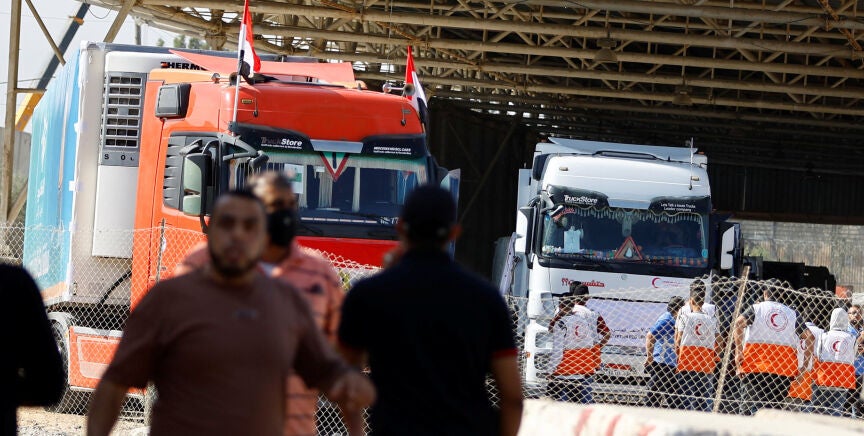 El paso fronterizo de Rafah ha abierto por primera vez en dos semanas de conflicto entre Israel y Hamás para permitir la entrada de ayuda humanitaria en la Franja de Gaza. La cadena oficialista egipcia Al Qahera News ha informado que serán unos 20 camiones los que penetrarán en la Franja para transportar "alimentos, suministros médicos, medicinas y ayuda humanitaria". Esta cifra coincide, de momento, con la ofrecida esta semana por el presidente de Estados Unidos, Joe Biden, quien afirmó que la primera tanda de camiones que cruce el paso, el único que no está controlado por Israel, sería de una veintena de camiones de ayuda.