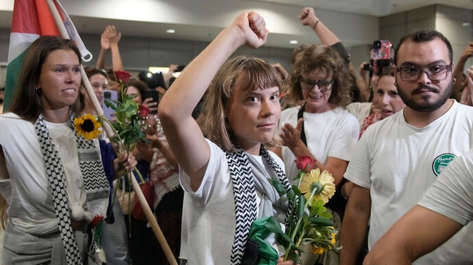 "Podría hablar durante mucho tiempo sobre los malos tratos y abusos que sufrimos durante nuestro encarcelamiento, pero esa no es la historia", señaló Thunberg ante los medios en el aeropuerto, donde los integrantes de la Flotilla fueron recibidos por cientos de personas con banderas palestinas y pancartas contra el "genocido".