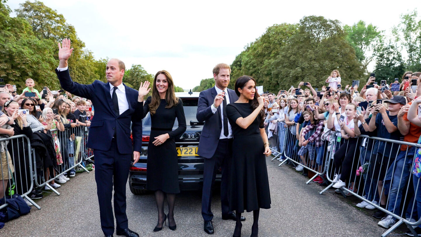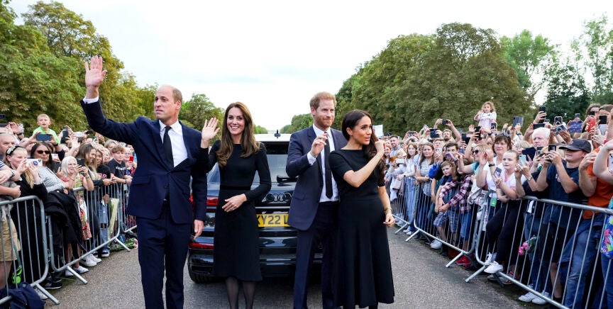 Vestidos de riguroso luto, los nuevos príncipes de Gales, Guillermo y Kate, y los duques de Sussex, Enrique y Meghan, miraron las flores, las tarjetas y dibujos de niños depositados ante el castillo de Windsor, antes de acercarse a los súbditos allí reunidos.