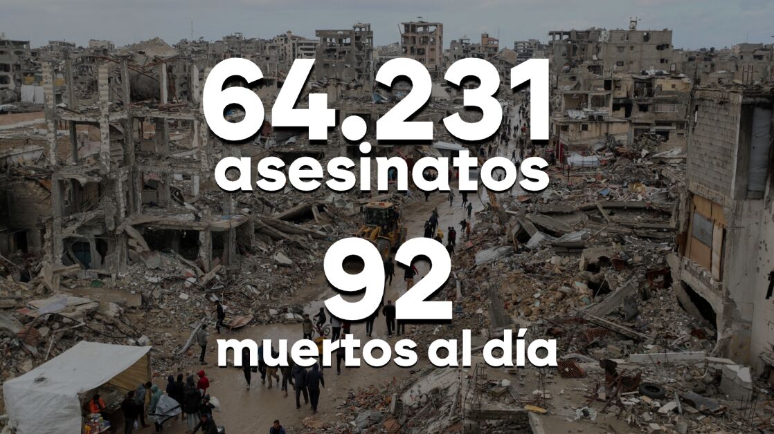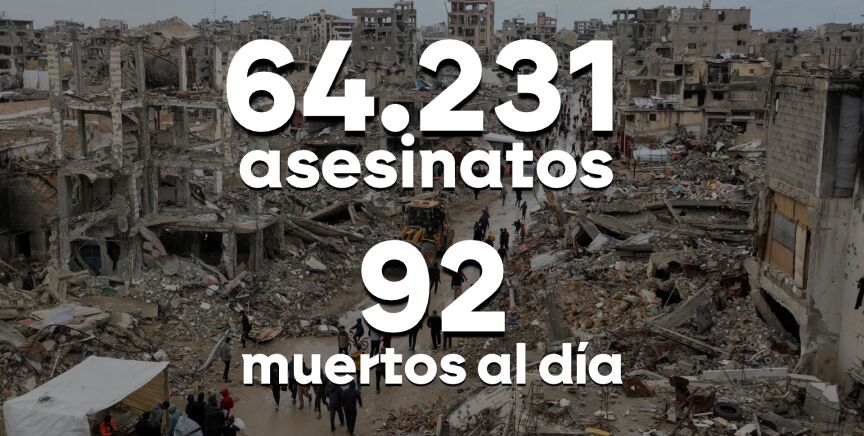Hasta el momento, en términos de víctimas civiles, ya son 64.300 las personas que han muerto durante esta guerra. De ellos, un tercio son mujeres y niños, 2.350 estaba buscando ayuda en el momento de ser atacados y 370 han fallecido por desnutrición, 131 de ellos niños, debido al bloqueo permanente de entrada de ayuda humanitaria. No serán los únicos, todavía hay que contar todas las víctimas que se encuentran bajo los escombros. Aunque para el ministro de Exteriores Israelí parece que 92 muertes al día parecen no ser suficientes.