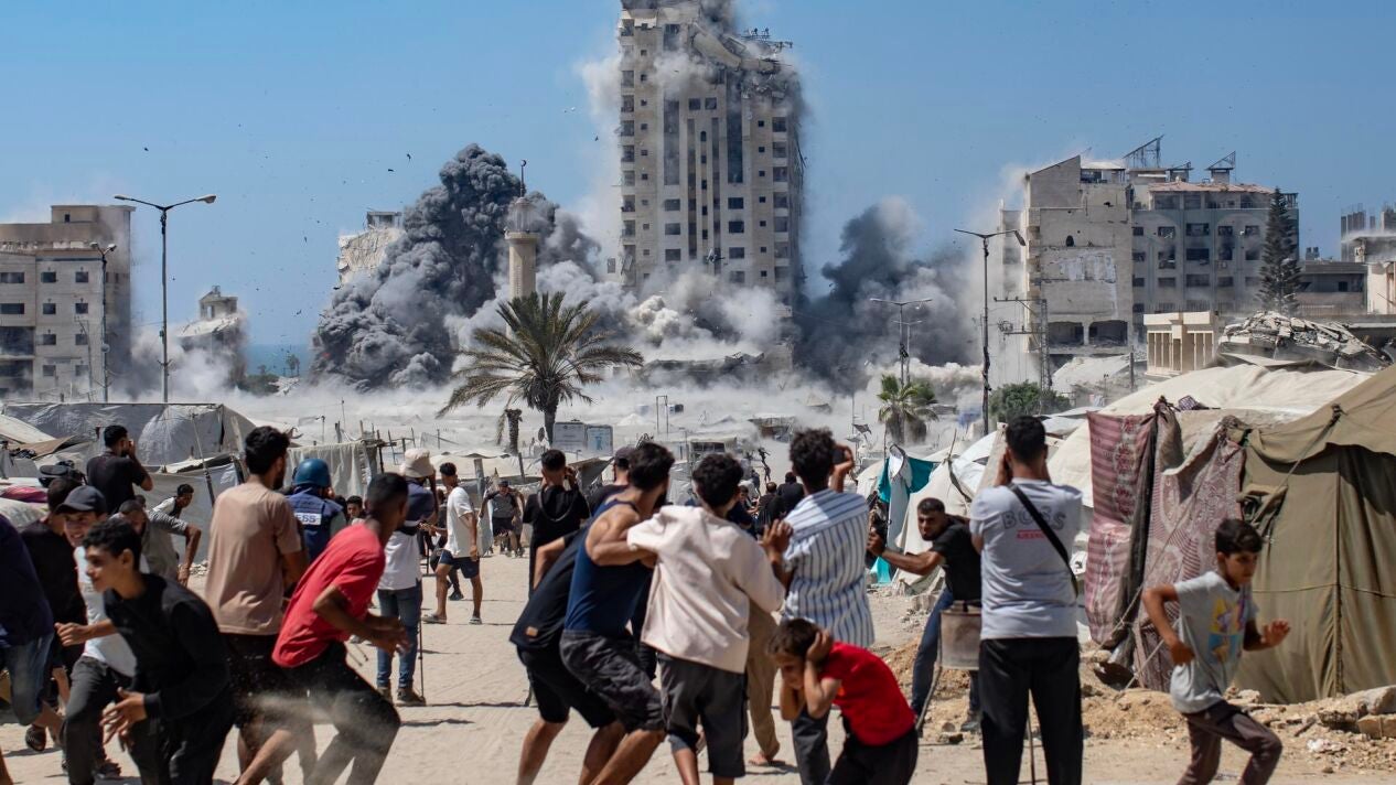 El Ejército de Israel justifica la destrucción de edificios en Gaza afirmando que son refugios de Hamás y ha creado una zona humanitaria para la población civil. Sin embargo, esta tarde murieron cinco gazatíes mientras buscaban ayuda, y 100,000 civiles han abandonado la ciudad, según el primer ministro israelí. Una mujer lamenta que no hay lugar seguro en Gaza, donde cada vez que se trasladan son atacados. Los que permanecen enfrentan peligros constantes, como el ataque que mató a mujeres y niños en una escuela. Además, un dron hutí impactó un aeropuerto israelí, causando dos heridos leves.